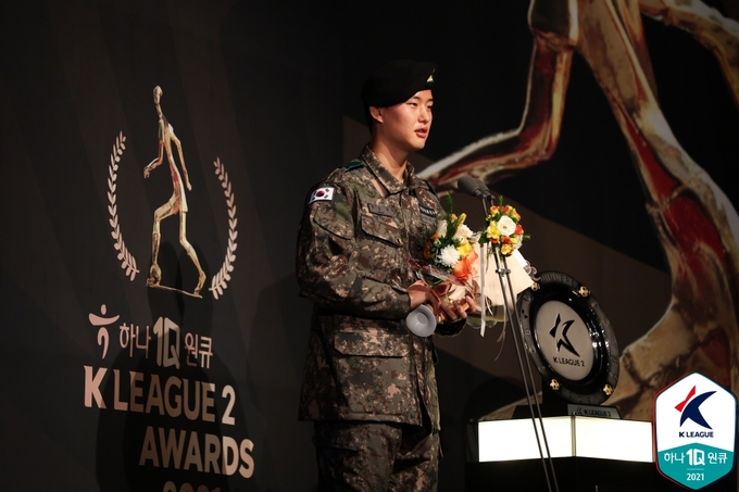 이어 정승현은 “김충섭 구단주님, 곽합 부대장님을 비롯해 시상식에 참석하신 배낙호 대표이사님께도 감사하다. 항상 도움주시는 오세진 선수단 주무, 에이전트에게도 감사하다. 마지막으로 군대라는 환경 속에서 항상 좋은 분위기를 만들어주시고 긍정적인 에너지, 동기부여를 주시는 펩태완 김태완 감독님께 감사드린다”고 수상 소감을 전했다.