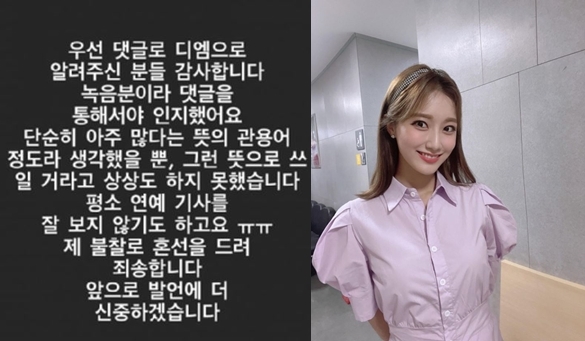 이에 김도연 아나운서는 자신의 인스타그램 스토리를 통해 “우선 댓글과 DM으로 알려주신 분들 감사하다. 녹음분이라 댓글을 통해서야 인지했다”며 “단순히 아주 많다는 뜻의 관용어 정도라 생각했을 뿐 그런 뜻으로 쓰일 거라고 상상도 하지 못했다”고 해명했다.