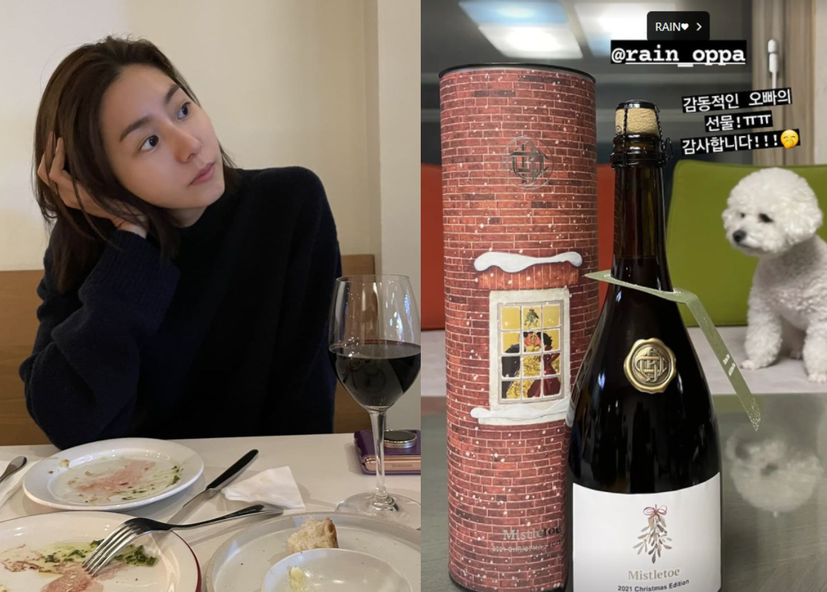 공개된 사진에는 비가 선물한 와인이 담겨있다. 연말 분위기가 물씬 풍기는 포장과 유이의 취향을 고려한 센스 넘치는 선물이 눈길을 끈다.