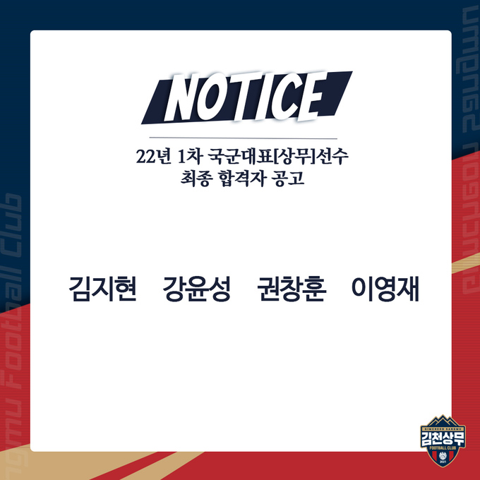 국군체육부대는 7일 오전 10시, ‘22년 1차 국군대표(상무) 운동선수(병)’ 최종합격자를 발표했다. 18명의 서류 합격자 중 최종 합격자는 권창훈, 강윤성, 김지현, 이영재 총 네 명이다.