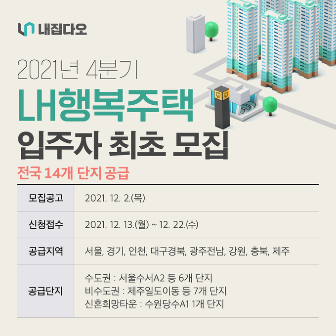 업체 측에 의하면 2021년 4분기를 마지막으로 지난 2일 LH 행복주택 입주자 최초모집이 공고됐으며, 오는 13일부터 청약 접수가 진행된다. 서울수서역세권 등 전국 14개 단지, 총 6871호를 모집하며, 입주자 최초모집으로 금회 당첨자로 선정될 경우 입주예정일에 맞춰 빠른 입주가 가능하다.