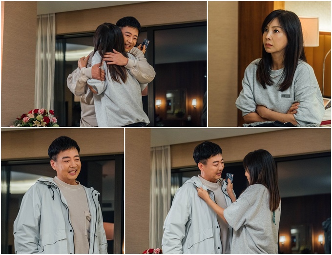 이와 관련 황신혜와 윤다훈이 냉담한 분위기에서 극적인 반전을 이룬, ‘환희의 포옹’ 장면이 이목을 집중시키고 있다. 극중 박희옥(황신혜)의 호텔방에 트레이닝복을 입은 오광남(윤다훈)이 은밀하게 찾아온 장면. 분노의 감정이 치솟는 듯 박희옥은 팔짱을 낀 채 못마땅한 기분을 드러내고, 오광남은 박희옥을 달래며 안절부절못한다. 하지만 이내 박희옥이 환하게 웃어 보인 데 이어 오광남까지 화통한 웃음을 터트리면서 냉랭한 분위기가 180도 달라지는 것. 박희옥을 와락 껴안은 채 행복한 미소를 짓는 오광남의 표정에서 두 사람의 ‘몰래한 사랑’이 어떤 결과를 이끌게 될지 궁금증을 자극하고 있다.