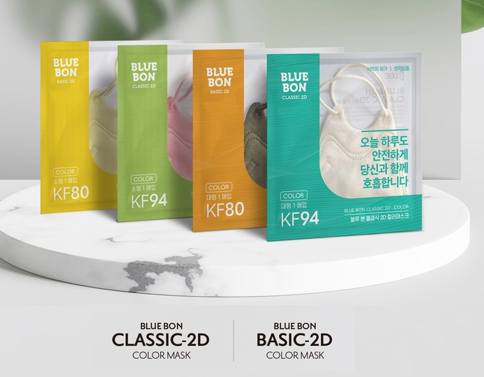 ㈜블루인더스가 새부리형 블루본 컬러마스크 KF94·KF80 소형·대형을 4색 컬러로 총 16종을 출시했다.