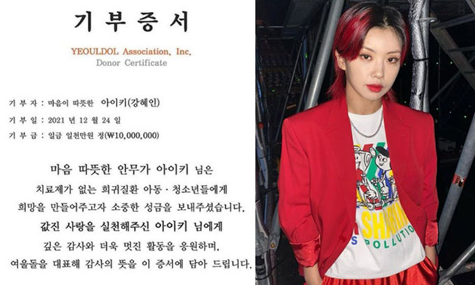 공개된 사진에는 희귀 질환을 앓고 있는 아동 청소년을 위해 1000만원을 기부했다는 기부증서와 함께 아이키가 산타 모자를 쓴 채 아이들과 함께 행복한 시간을 보내고 있어 훈훈함을 자아냈다.