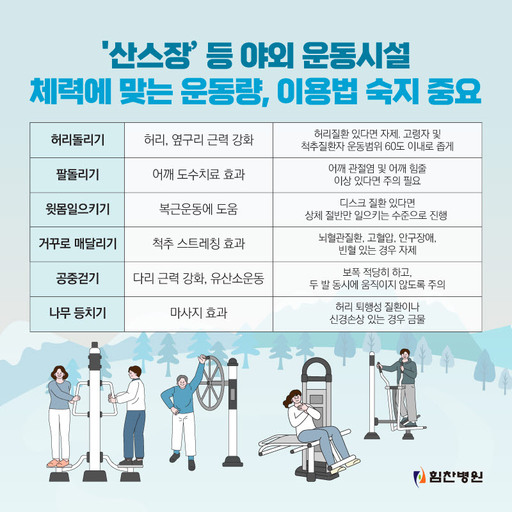 코로나19 사태가 장기화하며 실내 운동시설 이용이 녹록지 않은 상황에, ‘산스장’ 수요가 높아지고 있다. 산스장은 ‘산’과 ‘헬스장’을 합친 신조어로 산 중턱이나 정상 등에 있는 생활체육시설을 말한다. 6일 윤기성 목동힘찬병원 신경외과 원장의 도움말로 산스장 기구를 똑똑하게 이용하는 법(사진)에 대해 알아봤다.