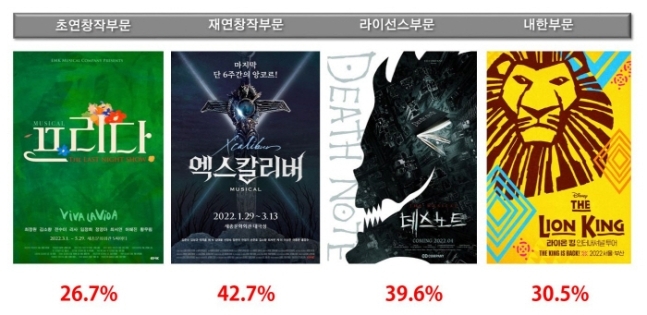 2022년 개막하는 초연 창작 뮤지컬 열 다섯 작품을 대상으로 한 가장 관람하고 싶은 작품은 3월 1일부터 세종문화회관 S씨어터에서 공연되는 '프리다'가 26.7%(493표)를 얻어 1위를 차지했다. '프리다'는 EMK뮤지컬컴퍼니와 추정화 작가, 허수현 작곡가가 탄생시킨 월드 프리미어 창작 뮤지컬로, 멕시코의 위대한 여성 화가 '프리다 칼로'의 생애를 액자 형식으로 그려낸다. 반면 초연작들 중에서는 '관람하고 싶은 작품이 없다'는 응답도 23.6%(436표)에 달해 두 번째로 높은 응답을 기록했다. 3위는 9.6%(177표)의 득표를 한 '웨스턴스토리', 4위는 7.6%(141표)의 '디아길레프', 5위는 7.5%(139표)를 얻은 '렛미플라이'가 차지했다.