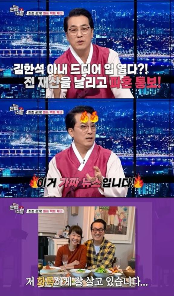 이날 김한석은 얼마 전 유튜브에 ‘김한석 아내 충격 고백 전 재산 날리고 파혼 강요’라는 제목의 영상 속 썸네일을 지적하며 가짜 뉴스에 대한 분노를 표했다.