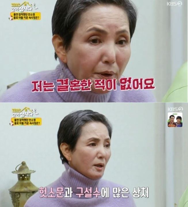 이날 안소영은 “1997년 아들을 출산한 뒤 미국으로 떠났다. 싱글맘을 이해하지 못하던 시대였다”며 “난 결혼한 적이 없다. 그냥 아이만 낳았다”고 밝혔다.