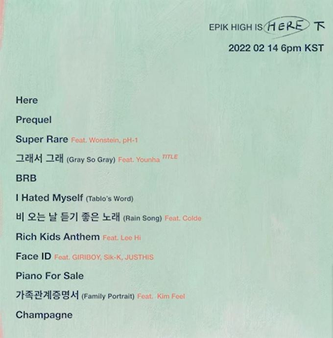 한편, 에픽하이의 ‘EPIK HIGH IS HERE 下 (PART 2)’은 오는 14일 오후 6시 전 온라인 음원사이트를 통해 발매된다.