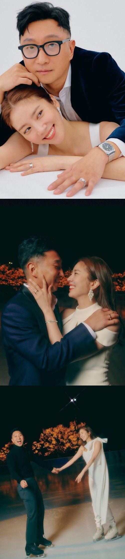 공개된 사진에는 이규혁과 손담비의 웨딩화보 비하인드 컷이 담겼다. 나란히 빙판 위에 올라선 두 사람은 손을 꼭 잡은 채 포즈를 취했다.