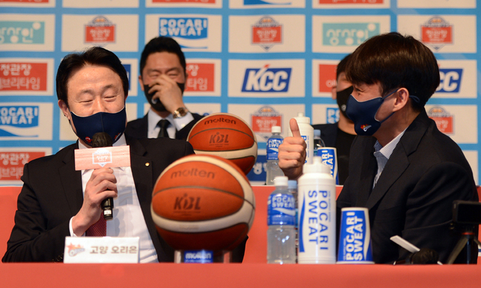 형식적인 자리인 만큼 단골 질문이 수차례 오갔다. 준플레이오프(준PO·5전3선승제)와 플레이오프(PO·5전3선승제)에서 기대하는 선수와 경계해야 할 상대 등을 짚는 질문이 주였다. 다소 딱딱하게 진행되던 행사장 분위기는 선수들이 마이크를 잡는 순간 달라졌다. 사회자의 부탁으로 각 대표선수가 한 명을 선정해 질문을 던지는 시간이었는데 대표선수 모두 타 팀 감독들에게 질문을 던졌다. 가스공사 가드 김낙현은 김승기 인삼공사 감독에게 “운이 좋은 비결이 무엇이냐”고 물었고, 모비스 가드 이우석은 강을준 오리온 감독에게 “따로 명언 공부를 하시느냐”고 던졌다. 질문을 접한 사령탑들은 붉게 물든 얼굴로 답하는, 선수가 공격하면 감독이 방어하는 식이었다.