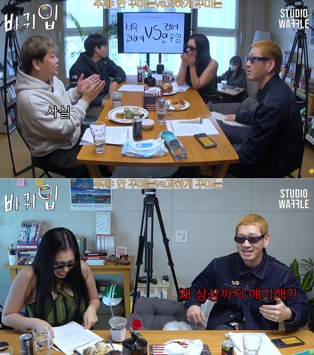 래퍼 뱃사공은 “왜 상상까지 하냐. 그건 네 선에서 끝내야지 왜 상상을 얘기해”라며 욕설을 내뱉기도 했다. 가비는 “평소에는 이렇게 안 입는다. 방송이나 무대에서만 이렇게 입고 완전히 오프면 화장도 아무것도 안 하고 다닌다”고 덧붙였다.