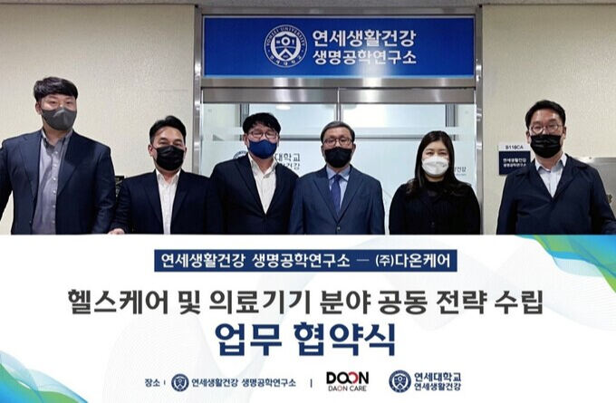 ㈜다온케어(대표 김원영)가 연세대 연세생활건강 생명공학연구소와 ‘헬스케어 의료기기 분야 공동 전략 수립 협력을 위한 업무협약’을 체결했다고 22일 밝혔다.
