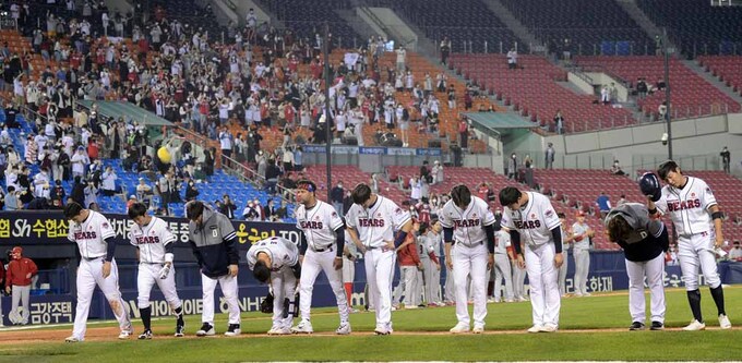 [SW포토]두산,'SSG에 3 대 9 패' 기사입력 2022-05-19 21:59:18 기사수정 2022-05-19 21:59:17 글씨 크기 선택 가장 작은 크기 글자 한 단계 작은 크기 글자 기본 크기 글자 한 단계 큰 크기 글자 가장 큰 크기 글자 프로야구 두산 선수들이 19일 잠실구장에서 열린 SSG와의 경기에서 패한 뒤 팬들에게 인사를 하고 있다. 잠실=김두홍 기자 kimdh@sportsworldi.com 2022.05.19. [ⓒ 세계비즈앤스포츠월드 & sportsworldi.com, 무단전재 및 재배포 금지] 메뉴보기 페이스북 공유 트위터 공유 url 공유 더보기