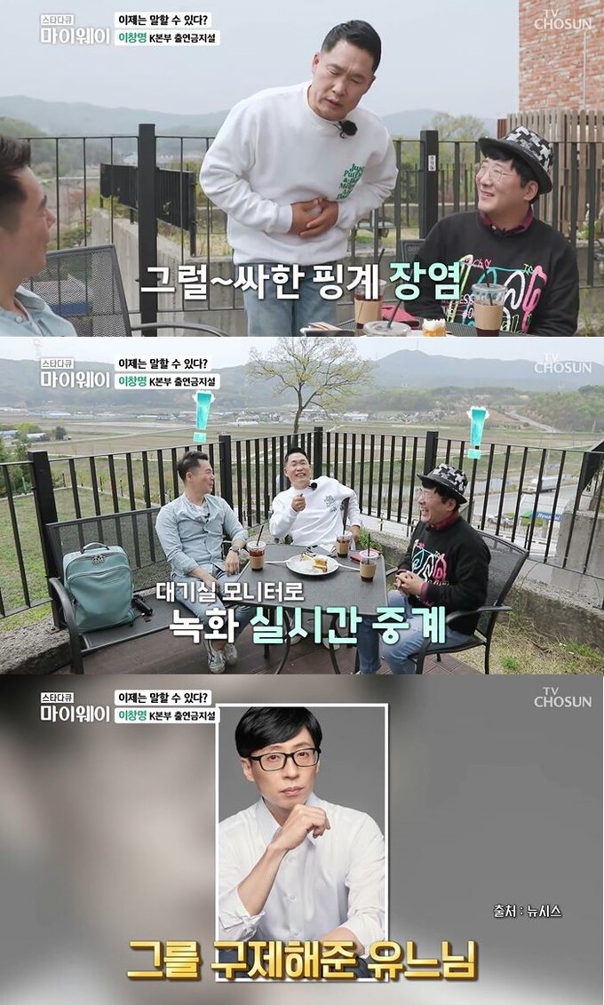 몰래 촬영을 하러 갔으나 모니터를 하고 있던 선배들에게 발각됐다고. 이창명은 “방송국마다 TV가 달려있다. 다른 스튜디오에서 무슨 녹화하는지 선배들이 앉아서 다 보고 있던 거다. 배아프다고 갔던 내가 녹화를 한걸 본 거다”라고 했다.