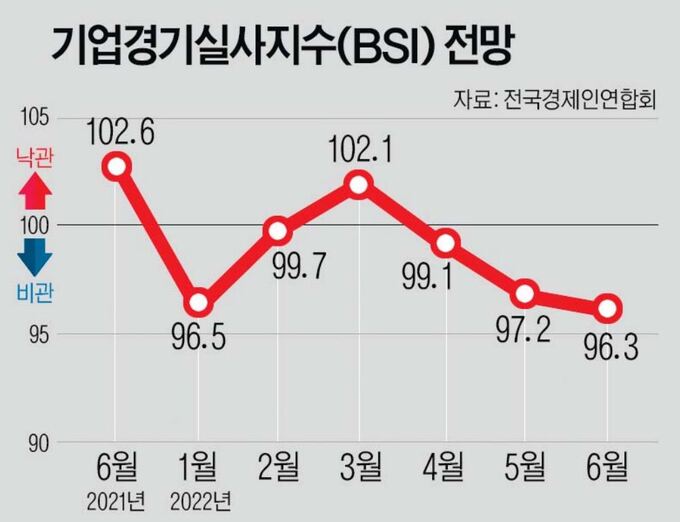 전국경제인연합회가 매출액 기준 600대 기업을 대상으로 실시한 기업경기실사지수(Business Survey Index) 조사 결과 6월 BSI 전망치가 96.3을 기록했다.