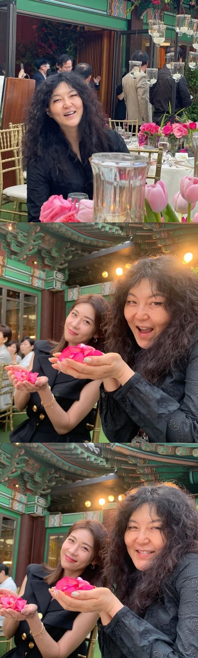 또한 옆자리에 앉은 배우 하지원과 꽃을 손에 든 채 환한 미소를 짓고 있다. 두 사람의 다정한 케미가 흐뭇한 미소를 부른다.