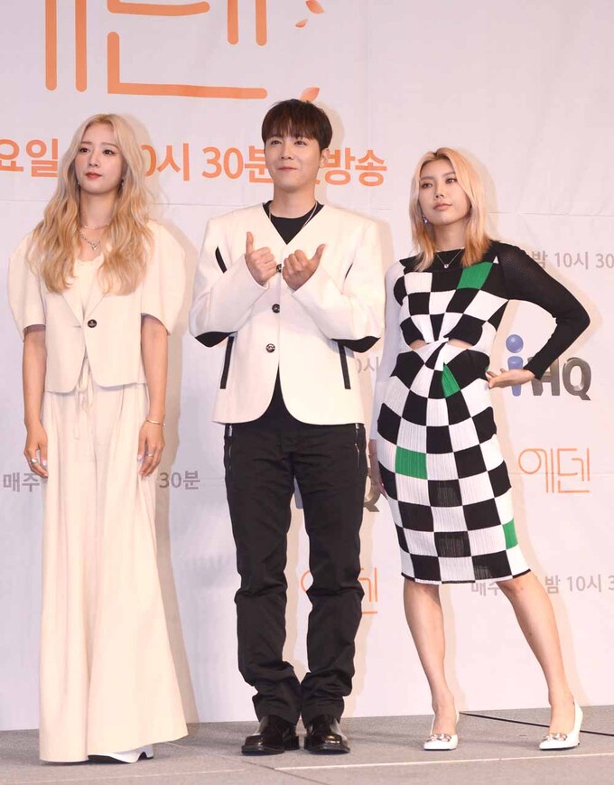 윤보미, 이홍기, 댄서 시미즈(왼쪽부터)가 13일 마포 서울가든호텔에서 열린 IHQ 새 예능 프로그램 '에덴' 제작발표회에 참석하고 있다.