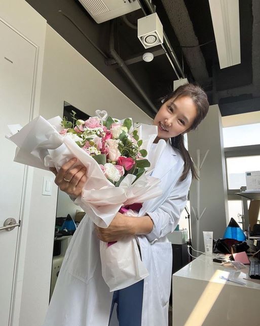 공개된 사진에는 의사 가운을 입은 채 사진을 남기고 있는 이수진의 모습이 담겼다. 이수진은 꽃다발을 든 채 환한 미소를 짓고 있어 눈길을 끈다.