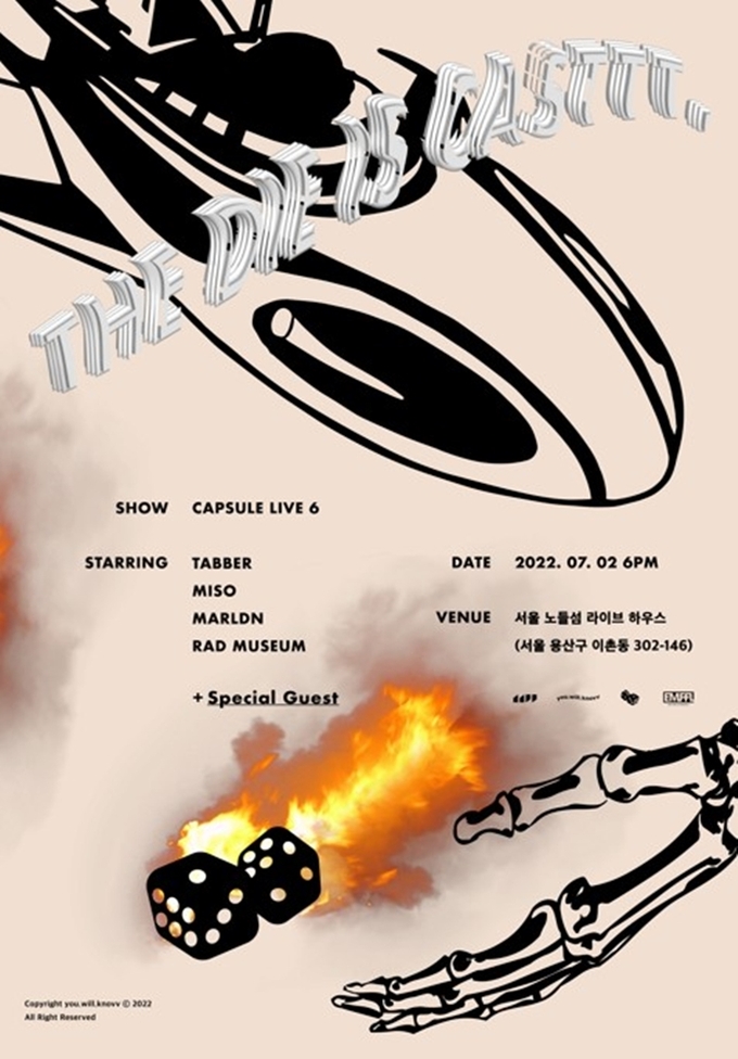한편, ‘THE DIE IS CASTTT; Capsule live 6’는 7월 2일 오후 6시 용산구 이촌동에 위치한 노들섬 라이브하우스에서 열리며 러닝타임은 총 120분이다.