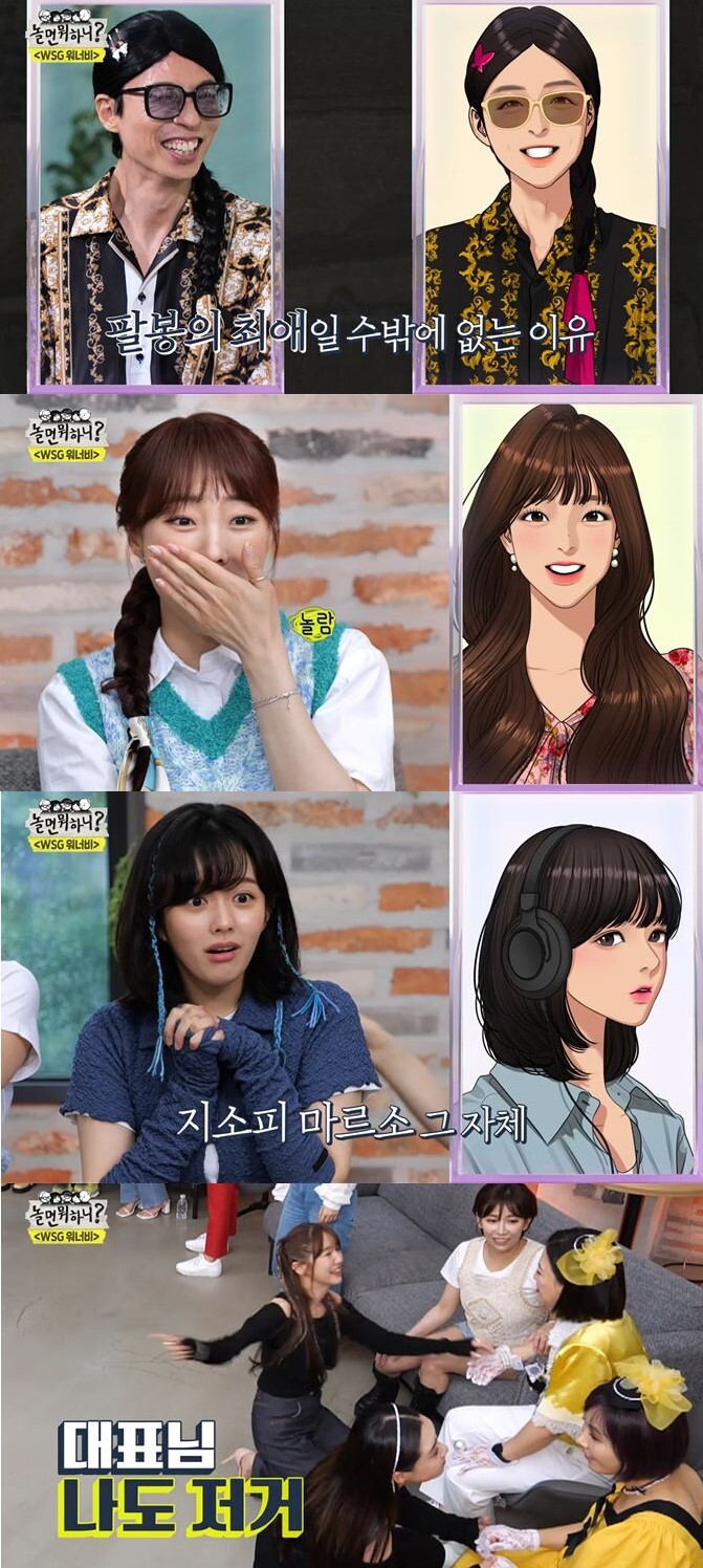 또 만화를 찢고 나온 것 같은 미주, 이보람과 소피 마르소 그 자체인 정지소의 여신급 비주얼이 부러움을 폭발시켰다. 윤은혜는 급기야 김숙 대표에 무릎을 꿇으며 “나도 저거”라고 해 웃음을 자아냈다. 신봉선은 “거짓말처럼 살고 싶냐”고 했고, 윤은혜는 “그려줬으면 좋겠다”라며 부러움을 내비쳤다.