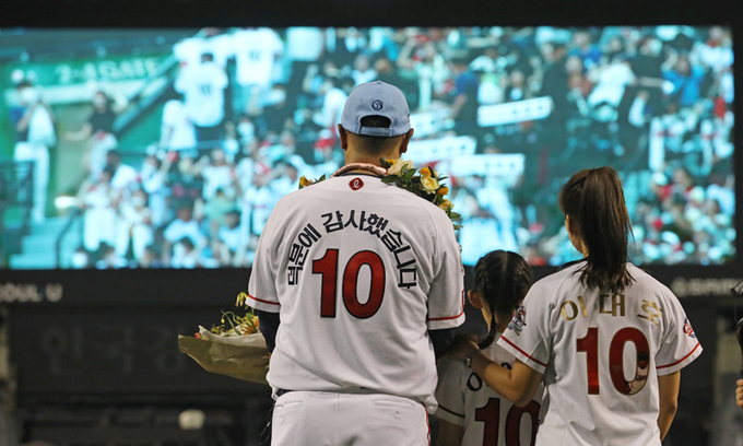 이대호는 2001년 신인드래프트 2차 1라운드(전체 4순위)로 롯데 유니폼을 입었다. 태극마크를 달고 국제무대에서 활약하기도 했다. 이대호를 기억하는 많은 이들이 의미 있는 순간을 함께했다. 아내 신혜정씨를 비롯해 딸 예서양과 아들 예승군이 자리했다. ‘캡틴’ 전준우(롯데)에서부터 일본 소프트뱅크 호크스 시절 인연을 맺은 오 사다하루 회장, 제리 로이스터 전 롯데 감독, 양상문 전 롯데 감독, 수영초등학교 시절 은사인 신종세 감독 등이 영상편지를 남겼다.