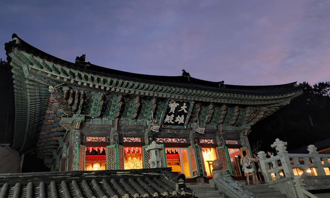 일주문을 지나 108계단에 들어서면 푸른 기장바다를 품은 해동용궁사와 마주하게 된다. 감탄이 절로 나오는 해안절경과 어우러진 저녁의 사찰이 한폭의 그림같아 오래 눈에 담는다. 해가 지기 전 연보랏빛으로 물드는 하늘과 검푸른 바다가 사찰을 감싼다. 대웅보전 경내에서는 스님들이 예불을 드리고 있다. 특히 한가지 소원을 꼭 들어준다 해서 참배객이 많이 찾는다.