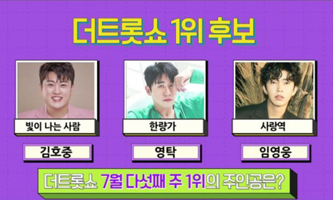 SBS FiL, SBS M '더 트롯쇼' 측은 25일 임영웅과 영탁, 김호중이 '더 트롯쇼' 1위 후보로 확정됐다고 밝혔다.