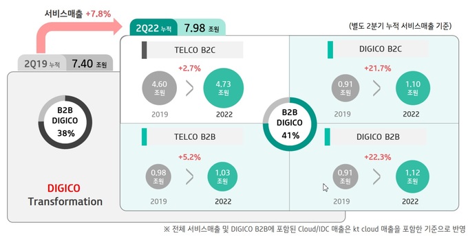 KT는 인플레이션 등 대외환경 변화로 인한 비용 증가와 일회성 인건비 영향으로 2분기 영업이익이 전년 동기 대비 감소했으나, DIGICO/B2B 중심 성장과 성공적인 그룹 포트폴리오 개편으로 사업 성장세가 이어졌다.