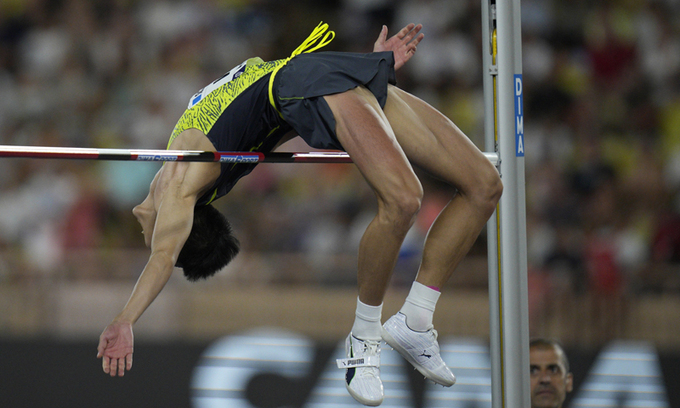 사진=AP/뉴시스 (우상혁이 모나코 퐁비에유 루이 2세 스타디움에서 열린 2022 세계육상연맹 다이아몬드리그 남자 높이뛰기 경기에서 바를 넘고 있다.)