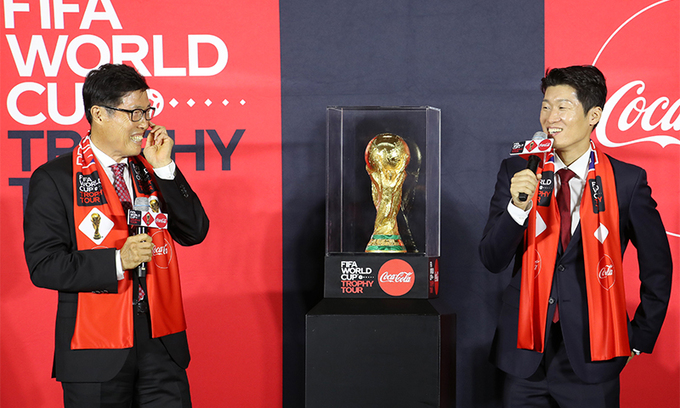 월드컵 공식 스폰서인 코카콜라는 24일 서울 여의도 더현대에서 ‘국제축구연맹(FIFA) 월드컵 트로피 투어’를 통해 트로피를 한국 팬들에게 공개했다. 이날 현장에는 한국 축구 레전드인 차범근 전 대표팀 감독과 박지성 전 선수가 자리했다.
