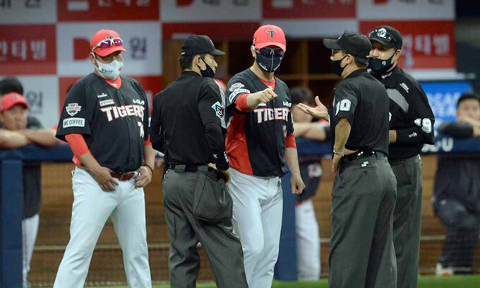 프로야구 김종국 KIA 감독은 지난 6월 25일 잠실 두산전서 야구규칙에 의해 퇴장을 당했다. 서재응 투수코치가 한 차례 마운드에 올라 투수 장현식과 이야기를 나눈 뒤 다시 장현식이 있을 때 마운드에 올랐다. 아무렇지 않게 흘러가던 상황은 심판진이 갑자기 모여 4심 합의 판정을 진행하면서 멈췄다. 심판위원이 ‘감독이나 코치는 동일 타자가 타석에 있을 때 또다시 그 투수에게 갈 수 없다’라는 마운드 방문 규칙을 설명했고, 김 감독은 지휘봉을 잡은 이후 처음으로 그라운드를 먼저 빠져나갔다.