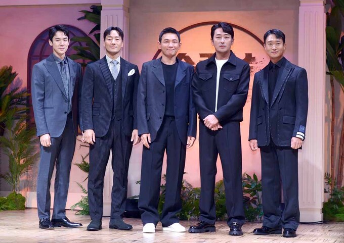 배우 유연석, 박해수, 황정민, 하정우, 조우진(왼쪽부터)이 7일 역삼동 조선팰리스에서 진행된 넷플릭스'수리남' 제작보고회에서 포즈를 취하고 있다.