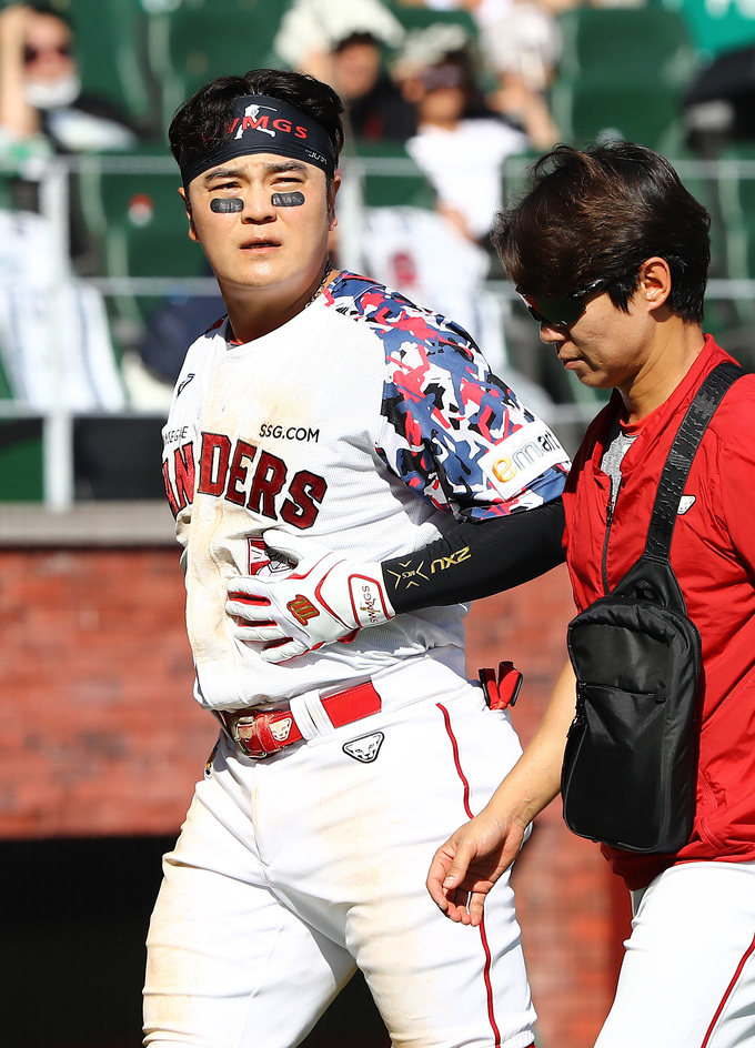 사진=SSG랜더스 제공/ 추신수가 18일 인천 두산전 도중 갈비뼈 부위 통증을 느껴 교체되고 있다.