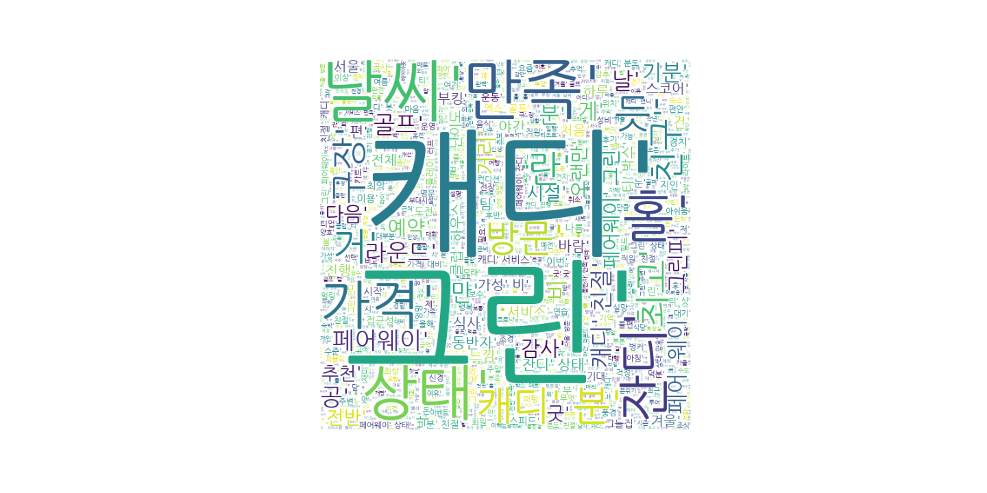 전체 후기 분석 결과, ‘캐디’, ‘날씨’, ‘그린’, 잔디’, ‘가격’ 등의 단어가 후기 중 상당수를 차지했다. 이를 통해 날씨 등 불가항력적인 부문과 함께 캐디의 서비스와 코스의 상태가 골프장 이용객의 만족도에 크게 영향을 끼치는 것으로 알 수 있다.