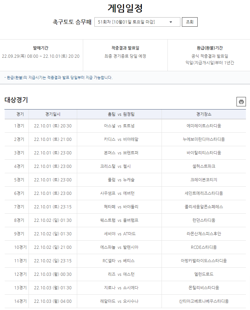 국민체육진흥공단이 발행하는 체육진흥투표권 스포츠토토의 수탁사업자 스포츠토토코리아가 오는 10월 1일(토)부터 3일(월)까지 열리는 잉글랜드 프리미어리그(EPL) 7경기 및 스페인 프리메라리가(이하 라리가) 7경기 등 총 14경기를 대상으로 하는 축구토토 승무패 51회차 게임을 발매한다고 밝혔다.