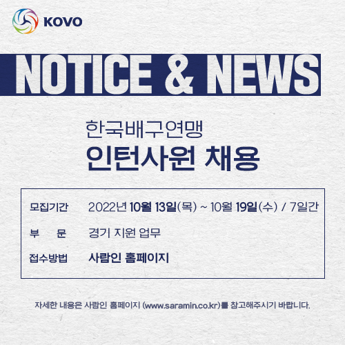 한국배구연맹(총재 조원태)이 문화체육관광부와 국민체육진흥공단의 지원으로 프로스포츠 분야 종사를 희망하는 우수 인재 발굴 및 실무 경험 제공을 통한 전문 인력 양성을 위해 인턴사원을 채용한다.