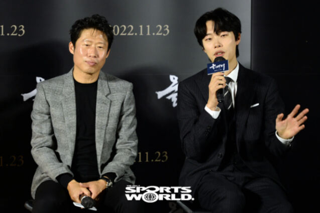 배우 류준열(오른쪽)이 용산 CGV에서 열린 영화 '올빼미' 제작보고회에 참석 기자의 질문에 대답을 하고 있다.