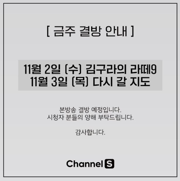 채널S는 1일 공식 유튜브 채널을 통해 “금주 방송 예정이었던 ‘라떼9’와 ‘다시갈지도’가 결방한다”며 “시청자 분들의 양해 부탁드립니다”라고 밝혔다.