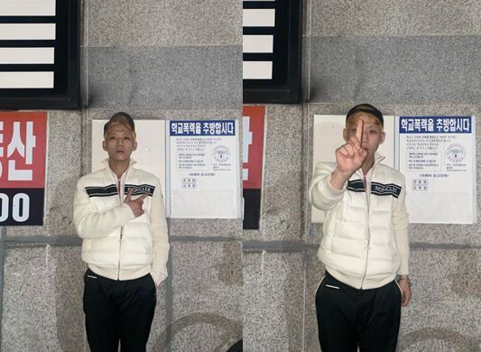 래퍼 양홍원이 ‘학교폭력 추방’ 포스터 앞에서 인증샷을 남겼다.