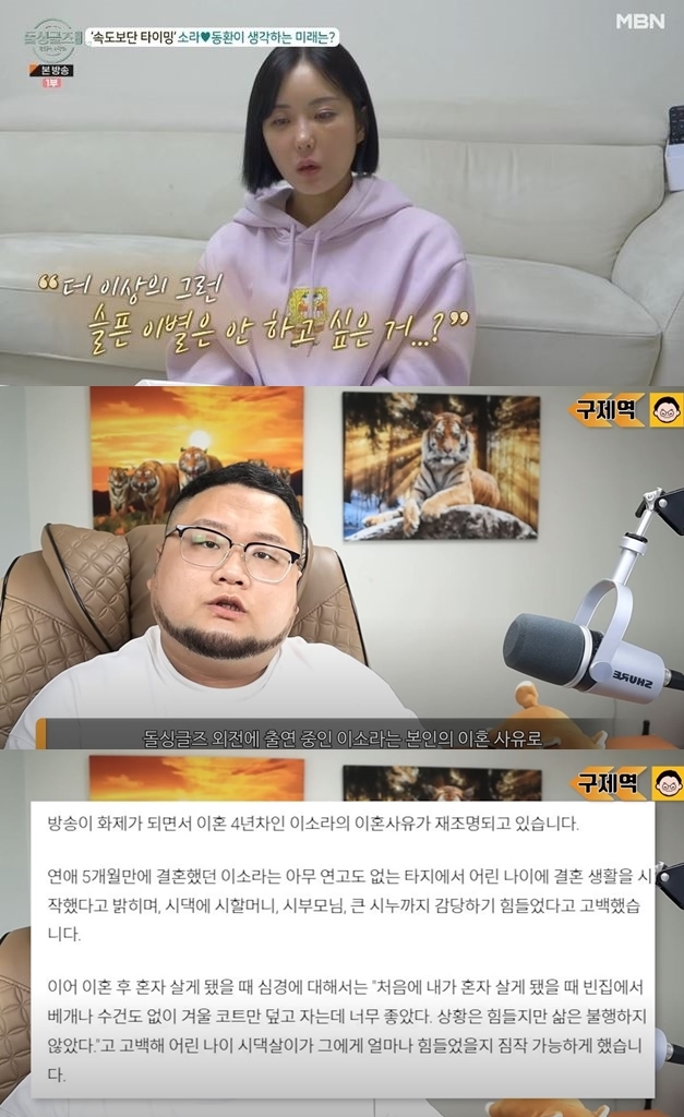 지난 13일 유튜버 구제역은 유튜브 채널을 통해 ‘돌싱글즈 이소라의 이혼사유는 상습불륜?’이라는 제목의 영상을 게재했다.