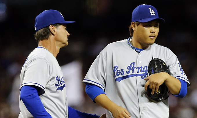 사진설명=다저스에서 한솥밥을 먹던 시절(2013년) 류현진(오른쪽)과 매팅리 전 감독의 모습.
