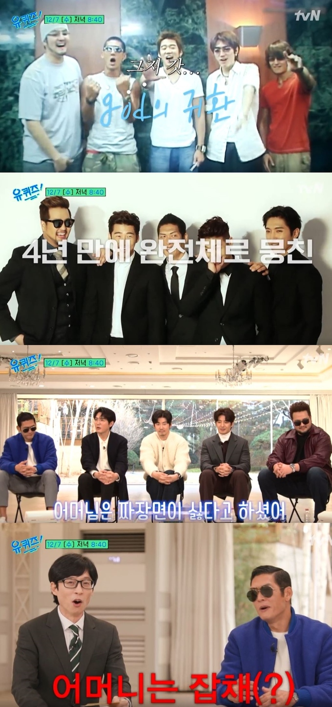 1999년 첫 정규 앨범 ‘Chapter 1’(챕터 원)으로 데뷔한 god는 ’어머님께’, ‘사랑해 그리고 기억해’ 등 수많은 히트곡을 내며 국민 그룹으로 불렸다. 이에 완전체 지오디가 유퀴즈에 등장하며 관심이 모아지고 있다.