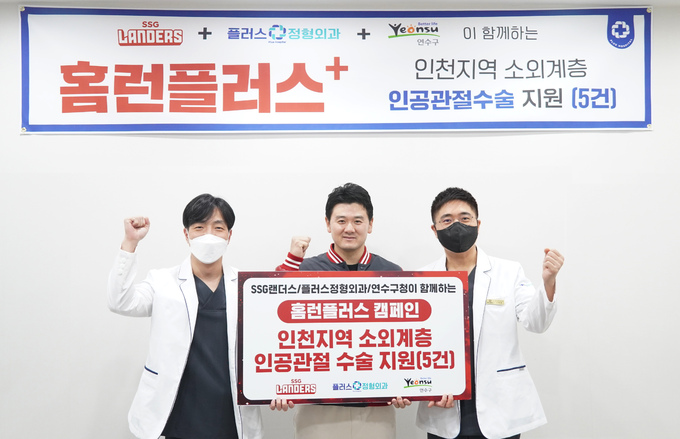 인천 송도 플러스정형외과가 프로야구 SSG랜더스, 연수구와 함께 진행하는 ‘홈런플러스+, 착한건강프로젝트’ 캠페인의 일환으로 총 5명의 저소득층 환자에게 인공관절 수술을 지원한다고 밝혔다.