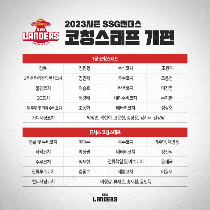 프로야구 SSG랜더스(대표이사 민경삼, 이하 SSG)는 15일 2023시즌을 대비해 코칭스태프를 개편했다.
