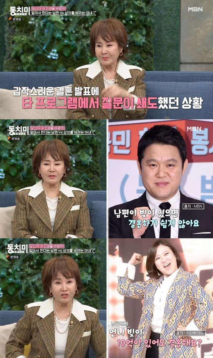 선우은숙은 ”내가 '동상이몽'에 가서 사람들이 ‘어떻게 갑자기 결혼을 했어요?‘ 묻길래 그냥 인연이 돼서 결혼했다고 했다. 그랬더니 김구라 씨가 ‘남편이 빚이 있으면 결혼하기 쉽지 않아요’라고 하더라. 괜찮다 했더니 김숙이 옆에서 ’언니 (남편에게) 빚이 10억이 있어도 결혼해요?’라고 해서 상관 없다고 했다”며 당시를 언급했다.