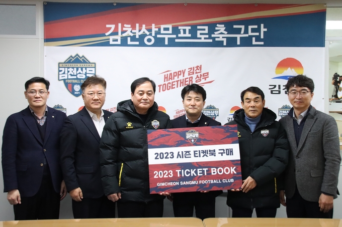 김천상무프로축구단이 27일 NH농협 김천시지부의 티켓북 구매 릴레이 행사를 열었다. 이로서 NH농협 김천시지부는 김충섭 구단주에 이어 두 번째로 2023 김천상무 티켓북 구매 릴레이의 주인공이 됐다. 이날 행사에는 NH농협은행 박기화 김천시지부장, 강동호 농정지원단장, 김상철 김천시청출장소장, 이남열 총무팀장, 김천상무 배낙호 대표이사, 최한동 후원회장이 참석했다.