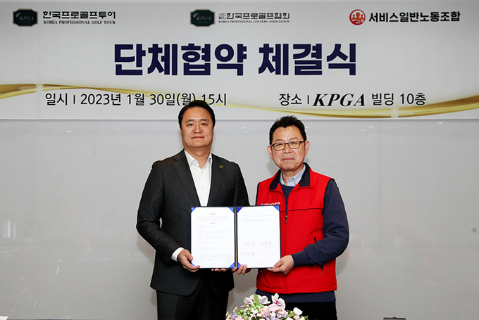 한국프로골프협회(이하 KPGA) 및 ㈜한국프로골프투어(대표이사 김병준, 이하 KGT)와 서비스일반노동조합은 30일 경기 성남시 소재 KPGA 빌딩 10층에서 단체협약을 체결했다.