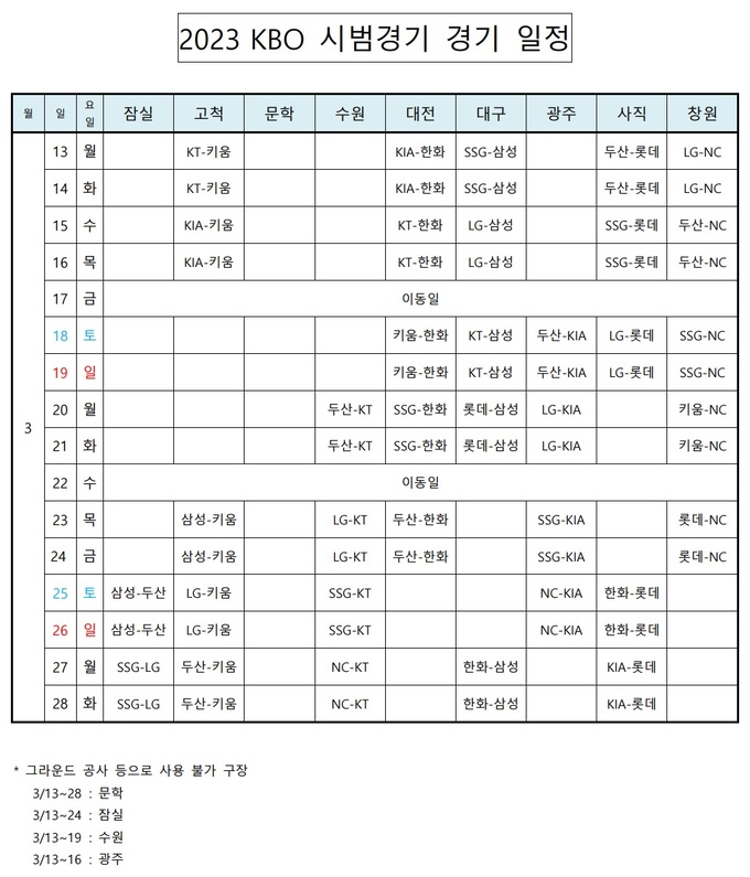 이번 시범경기 일정은 구단별 이동 거리와 그라운드 공사 등으로 사용이 불가한 구장(문학: 3월 13일~28일 / 잠실: 3월 13일~24일 / 수원: 3월 13일~19일 / 광주: 3월 13일~16일)을 고려해 편성했다.
