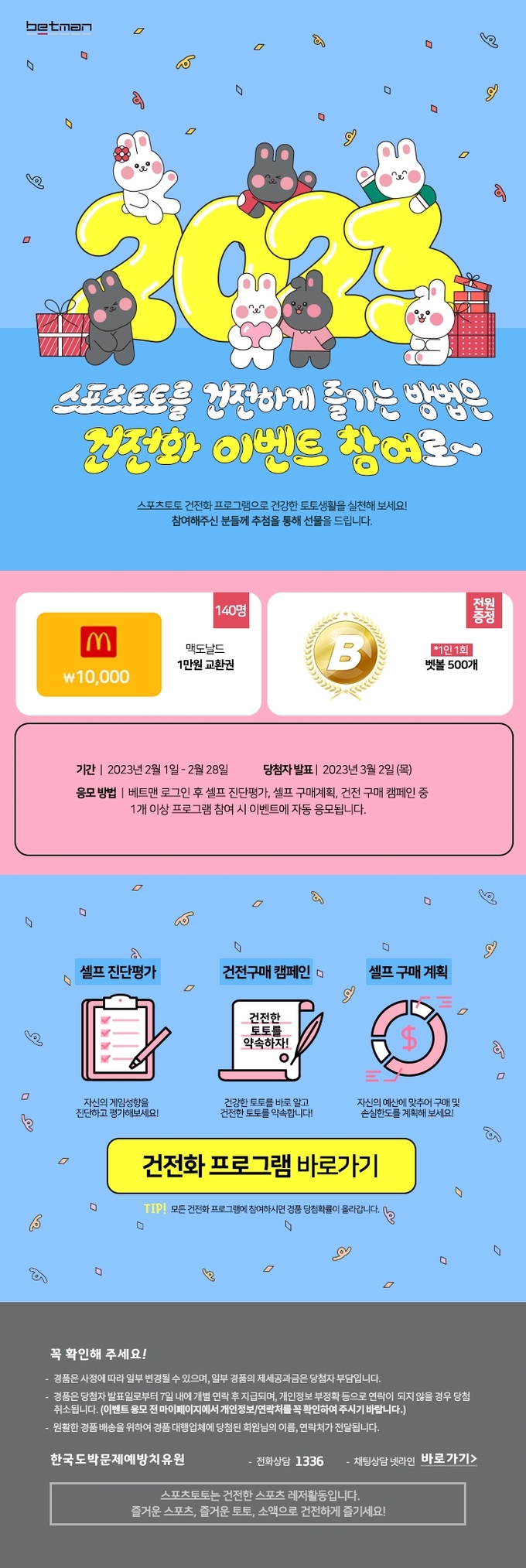 국민체육진흥공단이 발행하는 체육진흥투표권 스포츠토토의 공식 온라인 발매사이트 베트맨이 2023년 2월 건전화 이벤트인 ‘스포츠토토를 건전하게 즐기는 방법은 건전화 이벤트 참여로~’를 오는 28일까지 진행한다고 밝혔다.